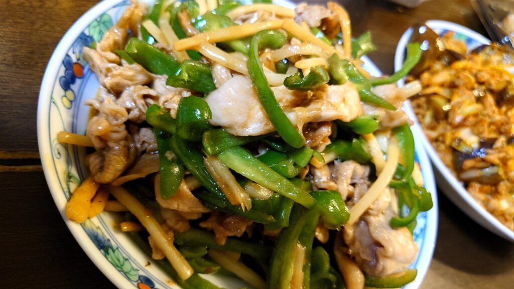 夕食には、久し振りにクックドゥ中華で青椒肉絲、それと別ブランドのたれつかって麻婆茄子を作る。